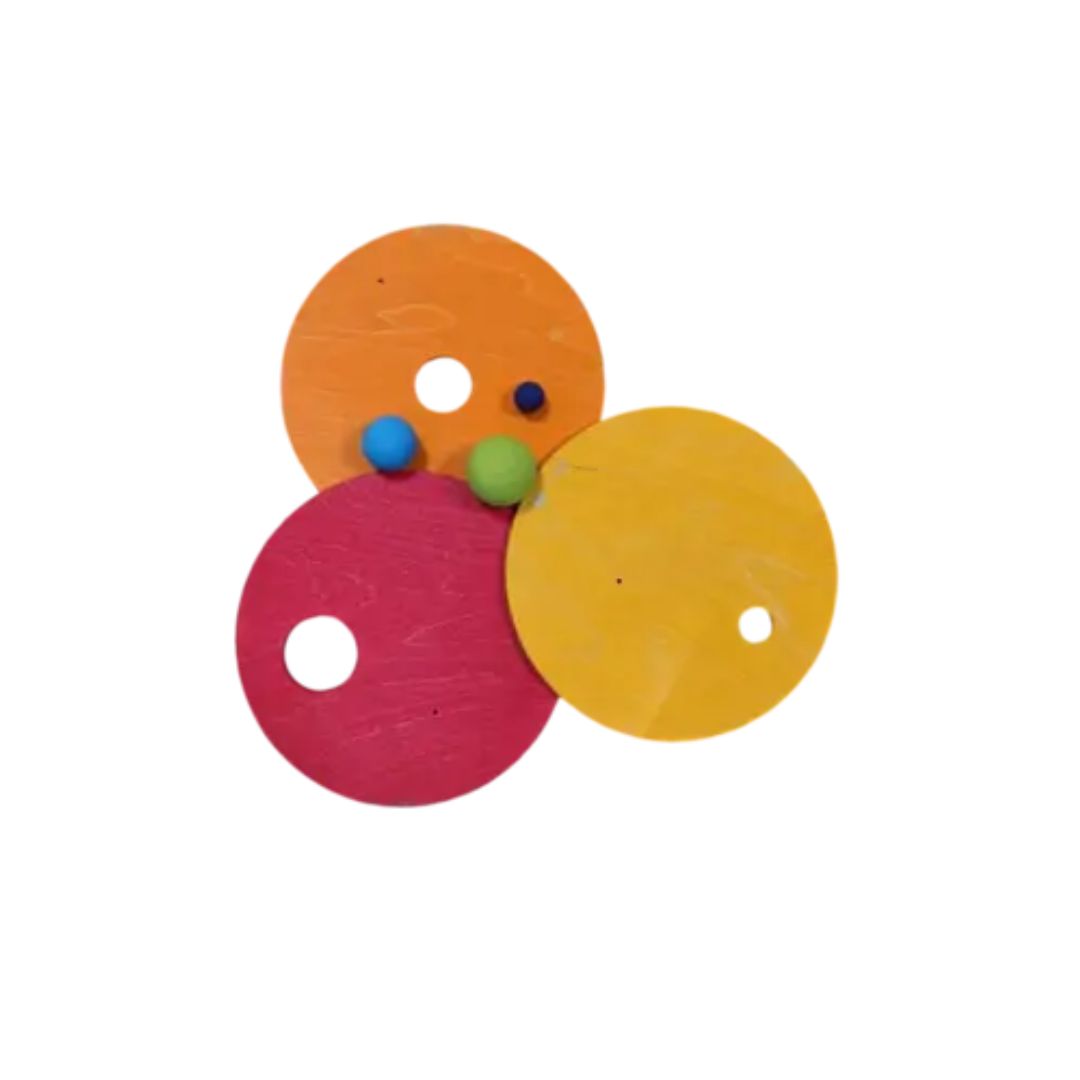 - This set has an orange, a yellow and a red wooden disc.