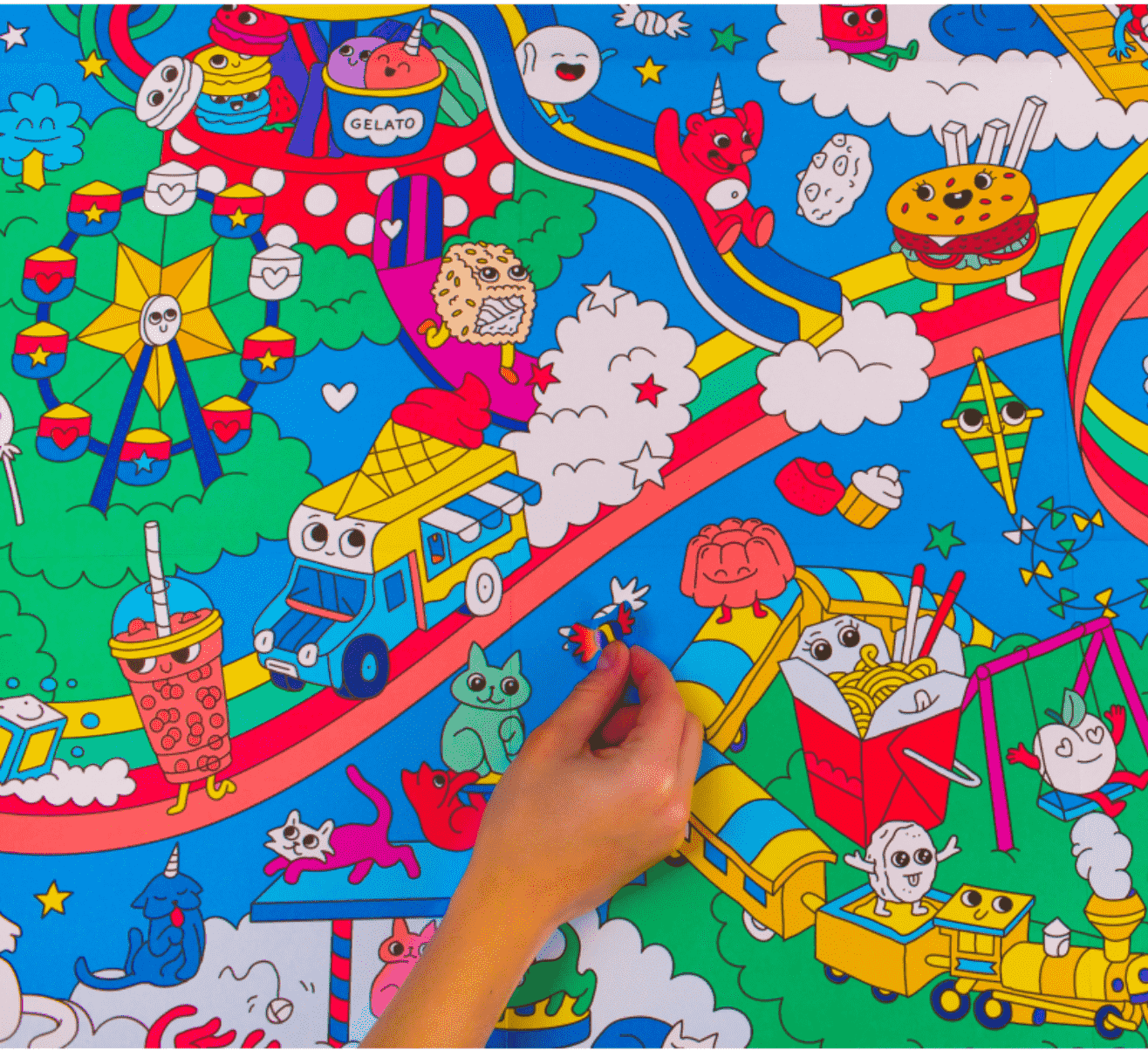 - On this surface is printed a very imaginative world, full of colorful figures.