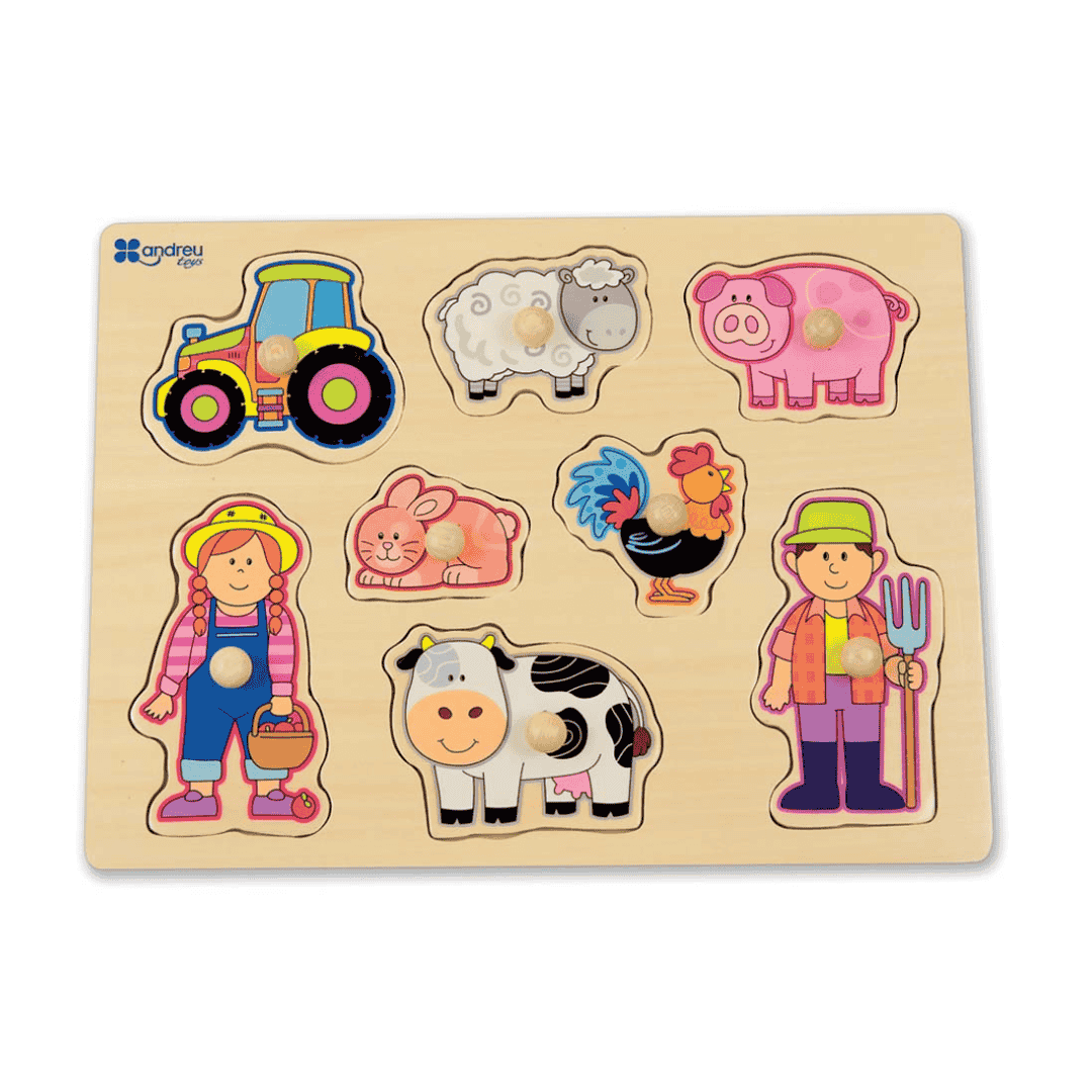 - Deze knoppuzzel van Andreu Toys telt 8 verschillende puzzelstukken om te passen, allemaal verschillende zaken van op de boerderij.