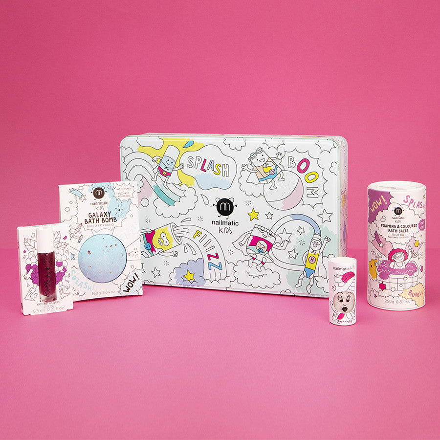 - Deze badbox van Nailmatic is een mooie metalen geschenkdoos met daarin: een tweekleurige badbruisbal, een flacon gekleurd badzout en een zakje knisperend badzout.