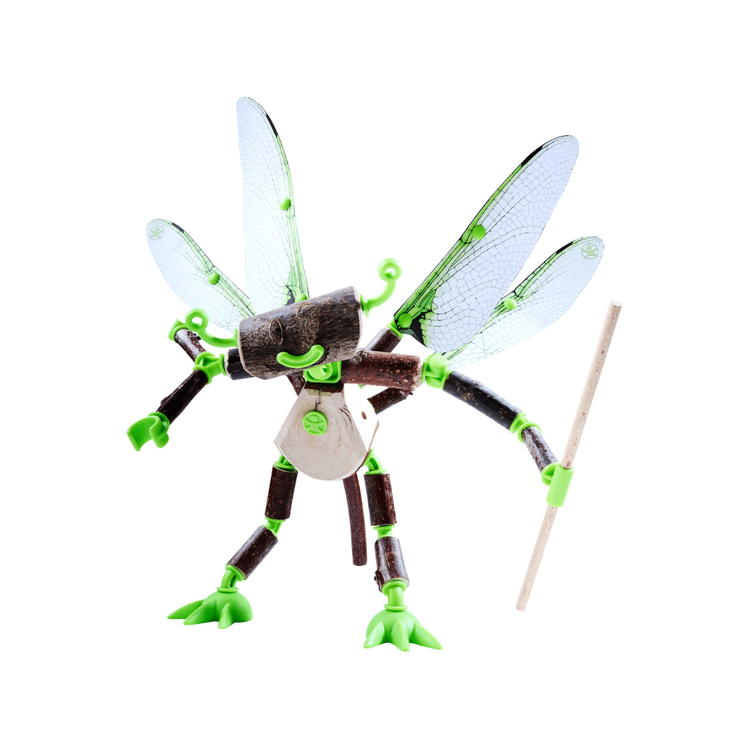 - De starterset bevat: 1 handboor (diameter 6 mm), 4 libelle-vleugels, 2 stokjes en 68 connectors.