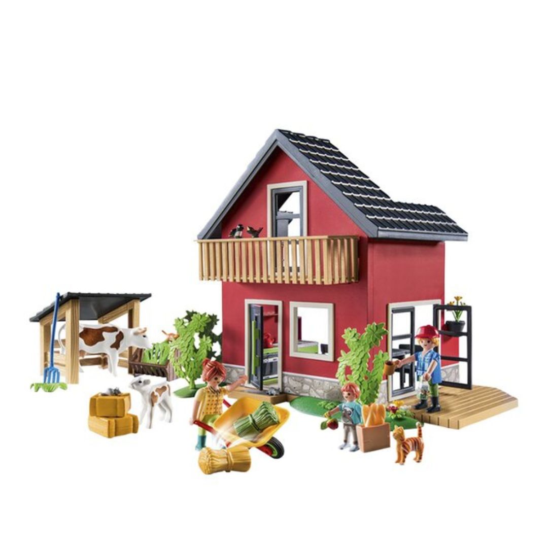 - Deze set bevat 137 onderdelen: naast het woonhuis met 2 verdiepingen, ook nog de volledige huisraad en een kleine stal met een koe en een kalfje.