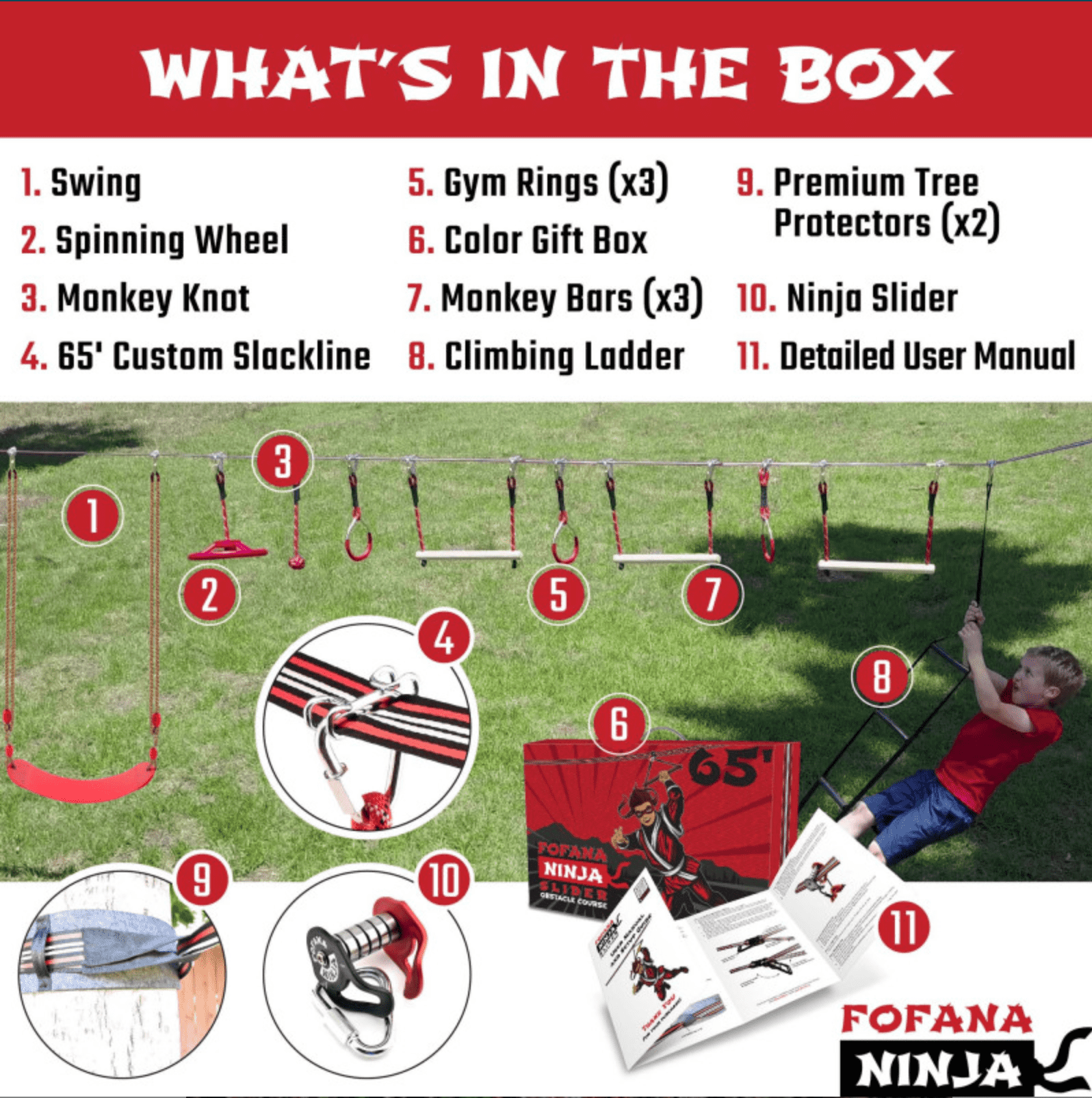 - Het Ninja obstakelparcours van Fofana is een hindernissenparcours dat je ophangt tussen 2 bomen of 2 palen. Avonturen in overvloed, voor de klimmers, de hangers en de slingeraars.