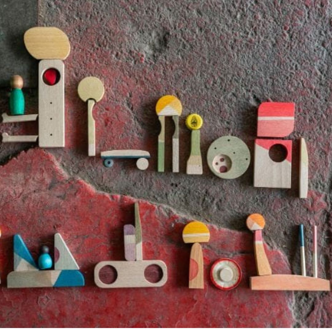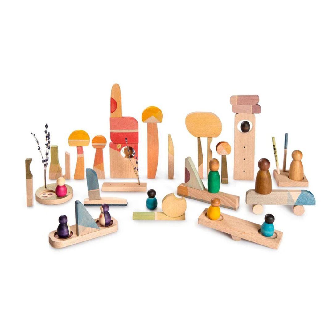 - Deze set bestaat uit 40 houten speelelementen. Speels, leuk en fantasievol: je ziet er een zowel een boom als een wolk in, of een auto, of een zeilboot. Compleet met poppetjes.