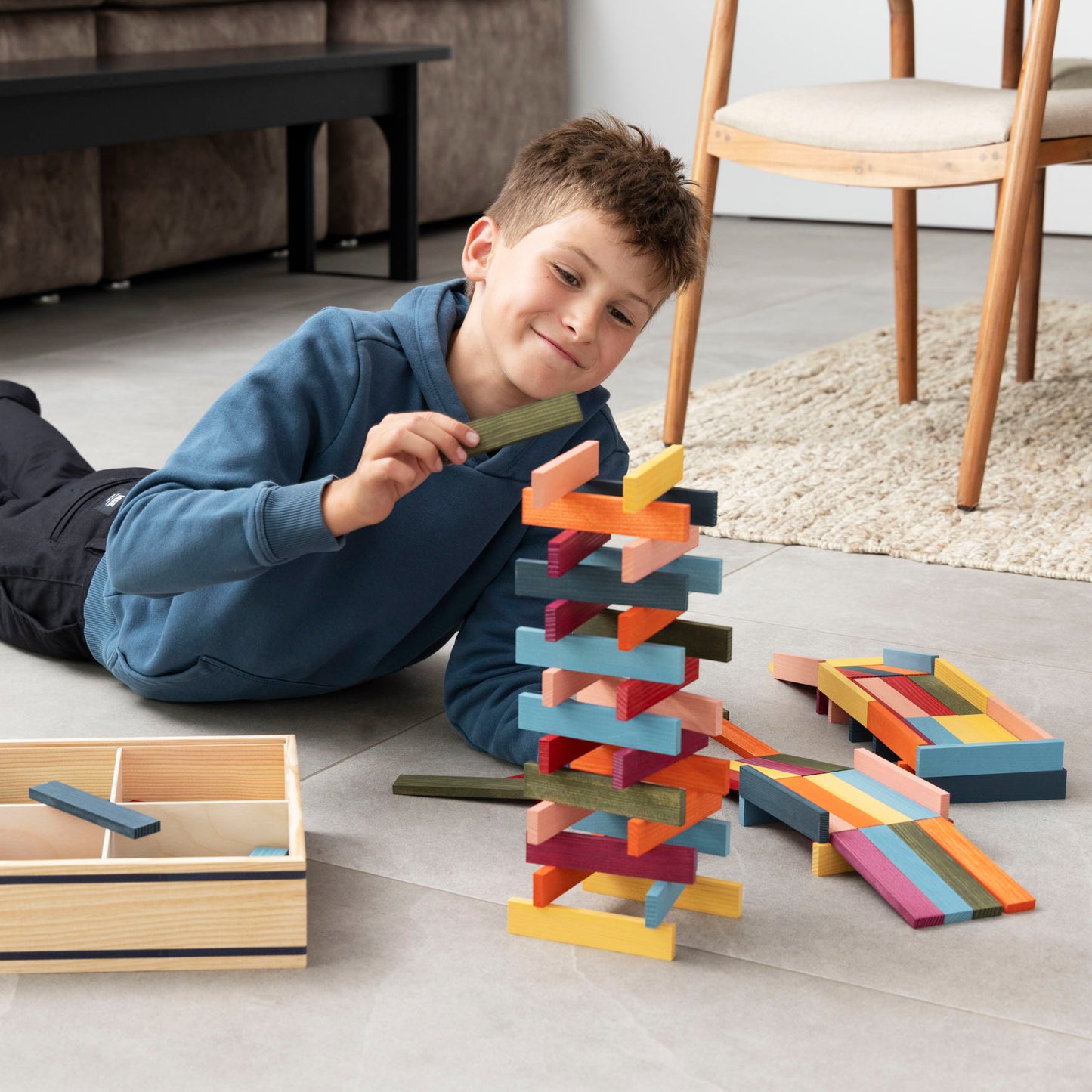 - De Octocolor box van Kapla bevat 100 houten plankjes in 8 verschillende kleuren (rood, oranje, geel, groen, lichtblauw, donkerblauw, roze en paars).