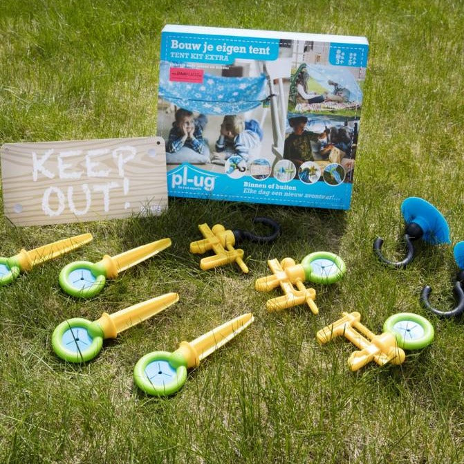 - De Pl-ug tentkit Extra bevat alle onderdelen om zelf op een simpele manier binnen of buiten een kamp te bouwen.
