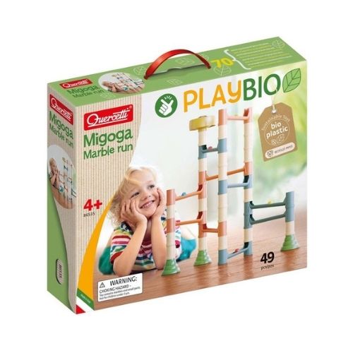 - Met de biolijn gaan ze verder in het duurzame aanbod. Deze Migoga Knikkerbaan is helemaal gemaakt uit bioplastic, wat bestaat uit gerecycleerd plastic en 40% houtvezels.